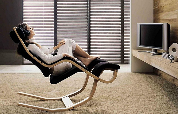 デスクに額をつけて昼寝する人がいれば、椅子の背もたれに身を委ねて昼寝したい人もいる。ただ後者の体勢で心地よく眠るのは、なかなか難しい・・・。そんな悩みを解決してくれる椅子が、「Gravity Balans (バランス・グラビティー)」。頭を支えるヘッドレストと、足を置くフットレストが備わっているので、身体を負担なく椅子に預けることができ、また、リクライニング機能によって、座った体勢から、寝そべる体勢へと自由自在に移ることができる。