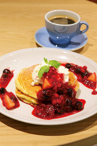 北海道産の甘酸っぱいルバーブジャムがたっぷり。パンケーキ「ルバーブ&5種のベリー」¥1,512