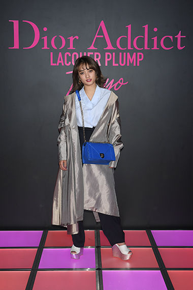 水原希子は、オレンジの華やかなドレスに合わせてディオール アディクトラッカー プランプ 556 ダンスフロアと538 ディオール グリッツの2色を重ね、コーラルのグリッターのメイクアップで登場。