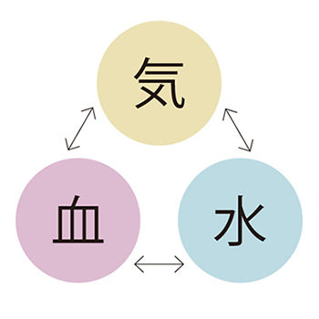 気・血・水は、健康な身体を支え合う三本柱のようなもの。このバランスや比重によって、人それぞれの“体質”も異なる。