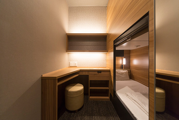 キャビンタイプの客室。関口氏の著書『月曜断食』(文藝春秋刊)の貸出しも。