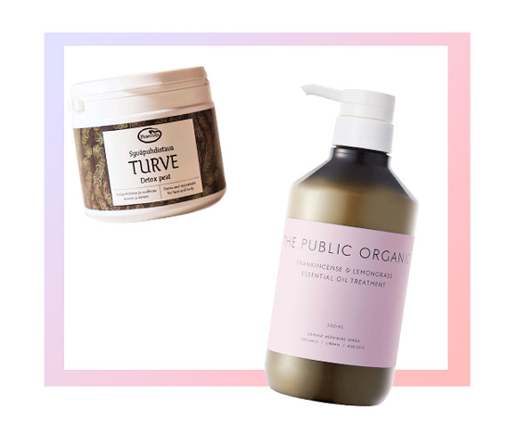左:髪だけでなく肌にも使える、美容効果の高い天然泥。ピートトリートメント 500㎖ ¥10,584/フランシラ 右:フランキンセンス、イランイランなどの精油ブレンドが、オキシトシン、β-エンドルフィンの分泌を刺激。洗い上がりはしっとりなめらかな手触り。ザ パブリック オーガニック 精油トリートメント スーパーポジティブ 500㎖ ¥1,667/カラーズ
