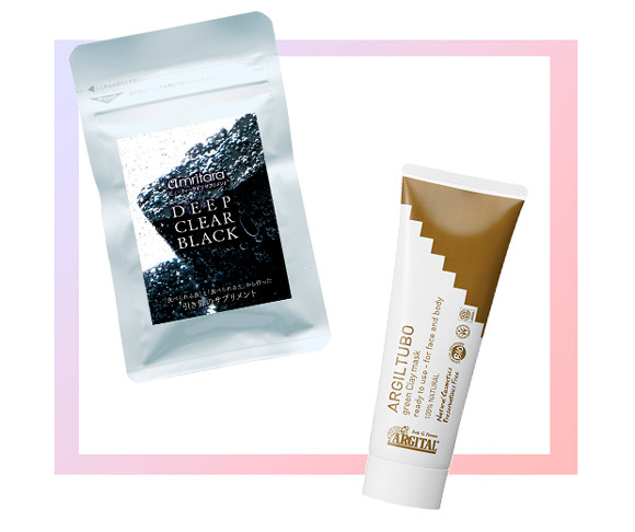 左:「食べられる炭」と「食べられる土」が体内の有害物質を吸着して排出。ディープ クリア ブラック(60カプセル入り) ¥3,888/アムリターラ 右:ミネラル豊富なグリーンクレイに、オーガニック植物成分を配合。便利なチューブタイプ。アルジタル グリーンクレイペースト 250㎖ ¥3,888/石澤研究所