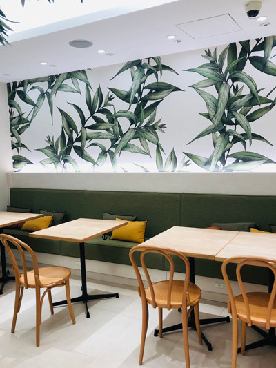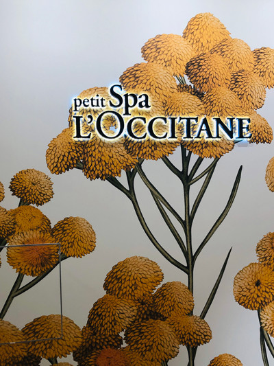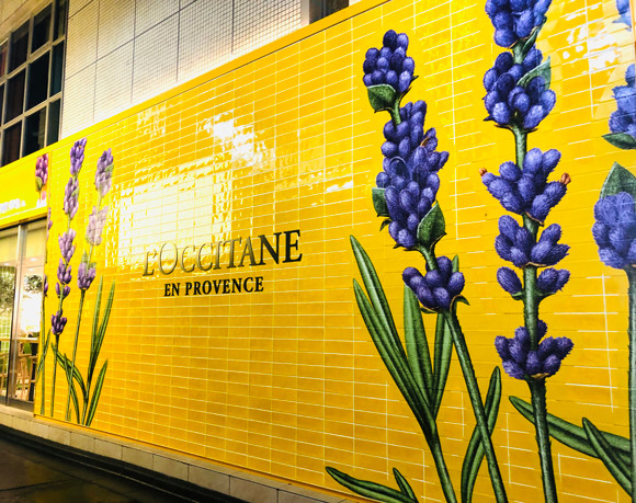 ここはカフェとスパが併設されたコンセプトブティック。スパが付いている直営店は日本では初です。地下1階にあるプティスパ ロクシタンへ続く階段の壁には、ロクシタンのスキンケア成分として使用されている黄色い花、イモーテルのイラストが描かれています。ロクシタンが植物とともに生きるブランドであることの象徴。