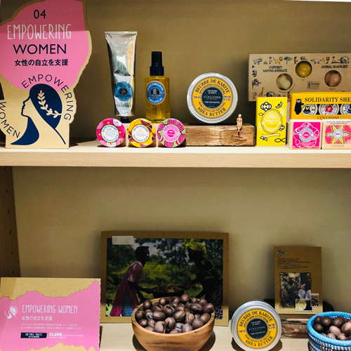1階のブティック部分には、プロダクトの販売だけでなく、ロクシタンのサステナビリティへの取り組みなどがわかりやすく展示されています。SDGsが企業精神に必要と叫ばれる世の中、ロクシタンは早いうちからこういうことに取り組んできたブランドです。