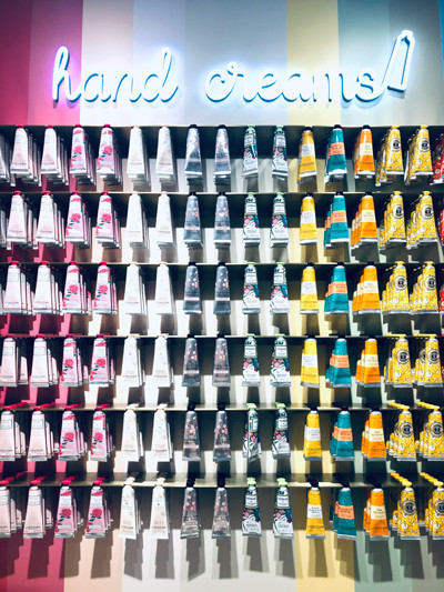 ハンドクリームテイスティングバー。レインボウな背景でナイス!です。
