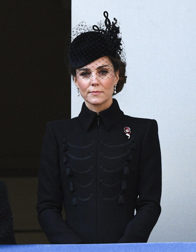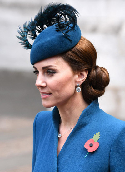 まずはアクセサリーから見てみよう。ファシネーターや帽子にカチューシャ。ケンブリッジ公爵夫人は、ロングヘアを飾るアクセサリー選びに気を抜かない。公務では、服の色に合わせたファシネーターを身につけることが多く、最近も、2019年11月11日のリメンブランスデーに、メッシュネットの飾りをあしらった黒のファシネーターを着用した。戦没者を悼む日にふさわしい、落ち着いた威厳を感じさせる装いだった。