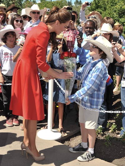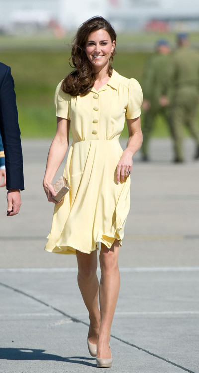 キャサリン妃のロングヘアはどんなシチュエーションにもばっちり。風の強い滑走路では、ハリウッド女優風のワンサイドヘアに。(カナダ・カルガリー、2011年7月7日)photo : Getty Images