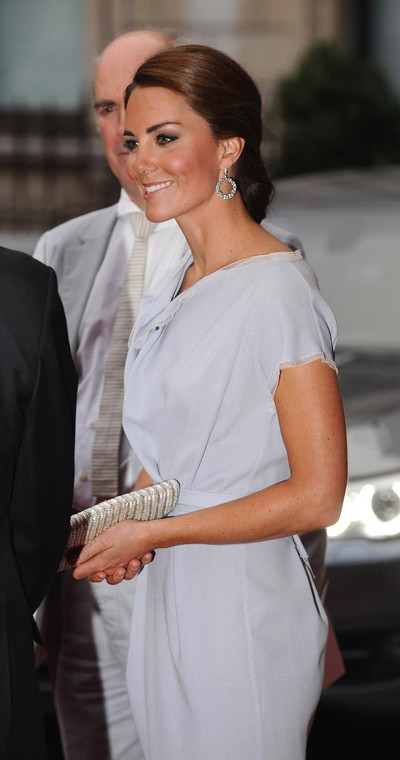 低い位置で留めたシニョン、黒のアイライン、ダイヤのイヤリング。洗練された60年代スタイルでまとめたキャサリン妃。オードリー・へプバーンは確かにイギリス人だったのだと納得。(イギリス・ロンドン、2012年7月30日)photo : Getty Images