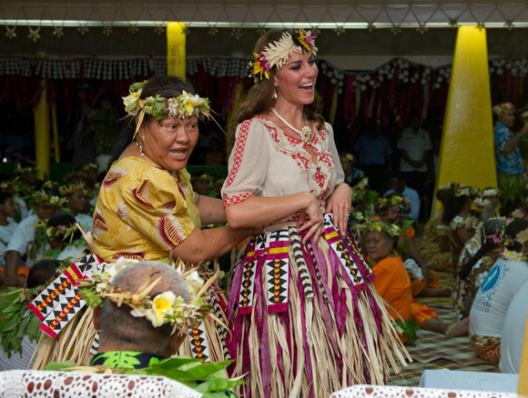 ナチュラルヘアに花輪を被って、タヒチ島の娘になった気分。どうやら外遊では、ロンドンで見せるいつもの艶やかなヘアはあえて忘れてみるようにしているようだ。(ツバル・フナフティ島、2012年9月18日)photo : Getty Images