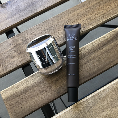 どちらも、ナチュラルな成分のスキンケア効果で紫外線吸収剤フリー。ベタつく季節にありがたいセミマットな仕上がり。淡いピンクやベージュの色みで肌補正するので、スッピンてわけでもないから、これで近所に買い物も行けちゃいます。