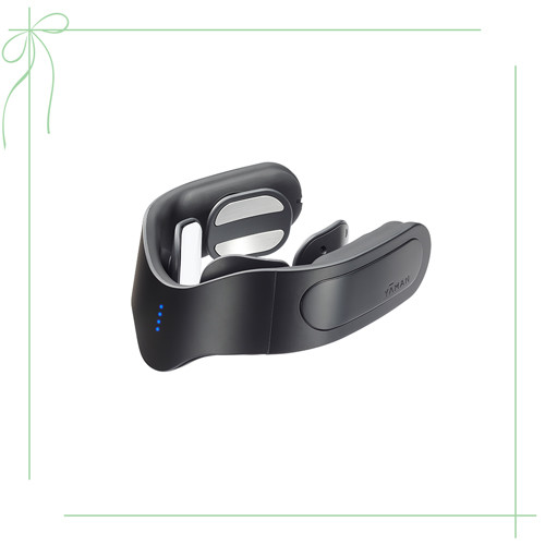 首を支える胸鎖乳突筋を温めながらEMS刺激を与えるウエアラブル美容器。前のめりの生活習慣などで衰えがちな筋力をアップして、首のコリやシワ、もたつき感もすっきり。さらに首の前面は、美容液の浸透を高めるパルス波でケア。