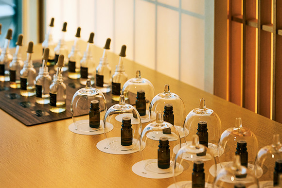 黒文字や高野槇などの和精油を含む12種類から好きな香りを選んでブレンド。持ち帰って日々の深呼吸にも役立てる。