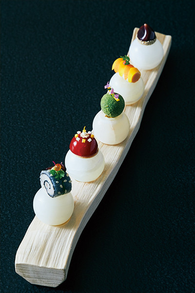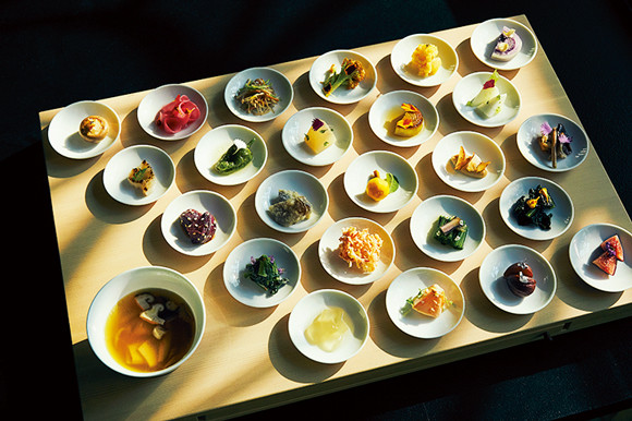 ディナーは、発酵食品とフレンチの技法を組み合わせたコース。手前から、たくあん、金山寺味噌、サンマのぬか漬け、かんずりなどを使って味付けした前菜。