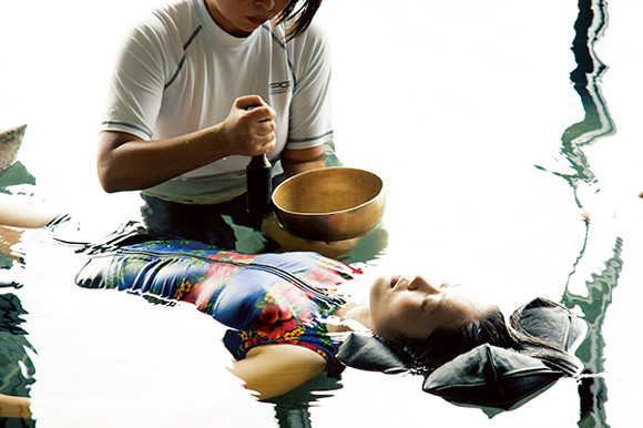 ソラノホテルのスパで始まったアクアセラピーのひとつが、水中アーユルヴェーダ。水中でシンギングボールを鳴らして音と水の波動で全身を包み込みながら、額に温水を垂らすシロダーラで脳に深いリラクセーションを与えるというもの。その後、室内でヘッドマッサージも行われる。