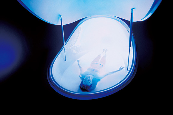 会員制のリトリートラウンジ、アンボーンでは、光や音を遮断して、皮膚温に保たれた高濃度のエプソムソルトの塩水に裸で浮かぶ装置で、重力から離れて脳がスイッチオフする体験が可能。身体の緊張が緩んで呼吸も深くなり、自然と瞑想状態に入ることができる。