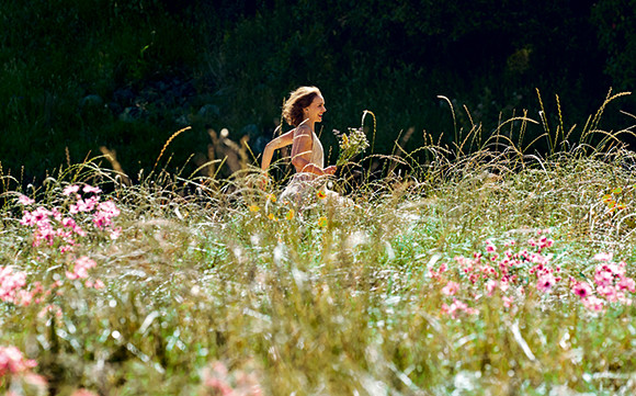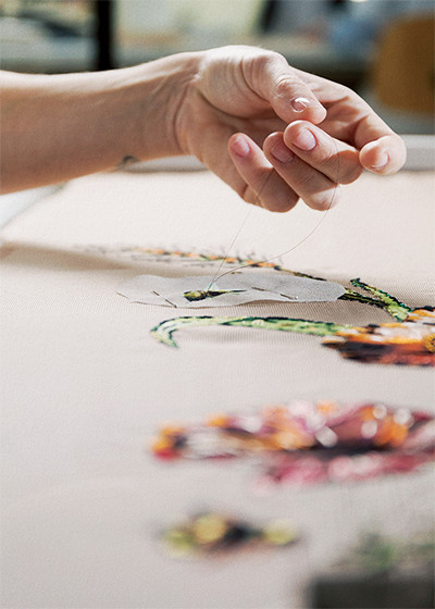 マリア・グラツィア・キウリの特別なドレスに身を包んだナタリー。モダンなシルクプリーツに木綿糸と絹糸を使い、手作業で一輪ずつ草花が刺繍されたドレスは、生命力あふれるクチュールメイドな逸品。ドレス(参考商品)/ディオール(クリスチャン ディオール)