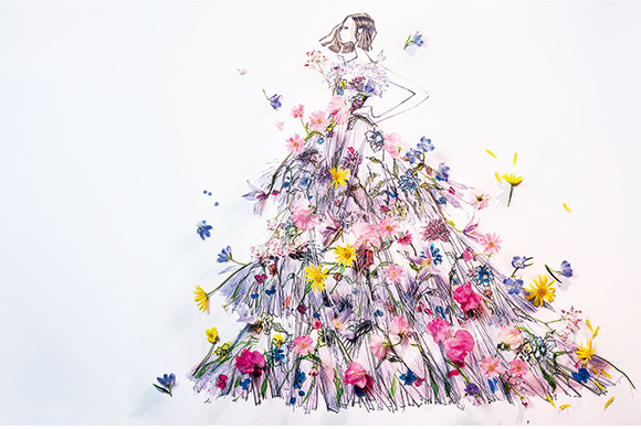マリア・グラツィア・キウリによるドレスは草原の花畑をそのままドレスに仕立てたようなオーガニック&ナチュラルな美しさ。500時間もの製作期間をかけて、職人により染色と刺繍が施された。