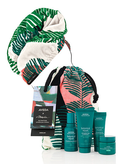 パッと目を引くグラフィカルなボタニカル柄の再生紙ギフトボックス入りで、開ける時のワクワク感がたまらない。濡れた髪もおしゃれにまとまるオーガニックコットンのヘアラップタオルに、ダメージヘア用のケア製品のトラベルサイズ。自然界をリスペクトし、地球を愛するメッセージが込められたサステイナブルなコラボコフレは、南国の海の旅のお供に喜ばれそう。