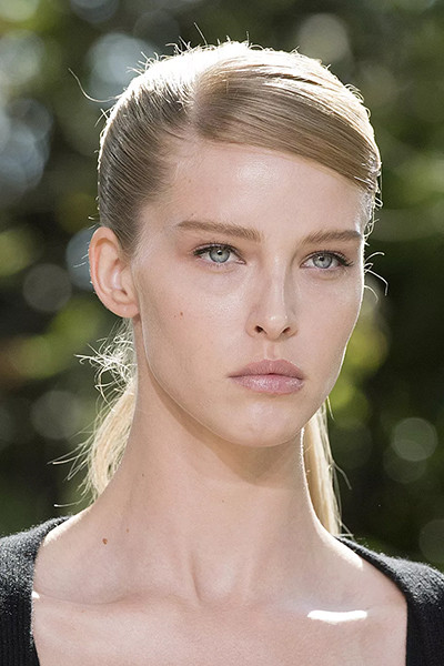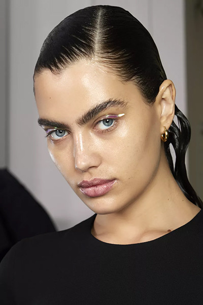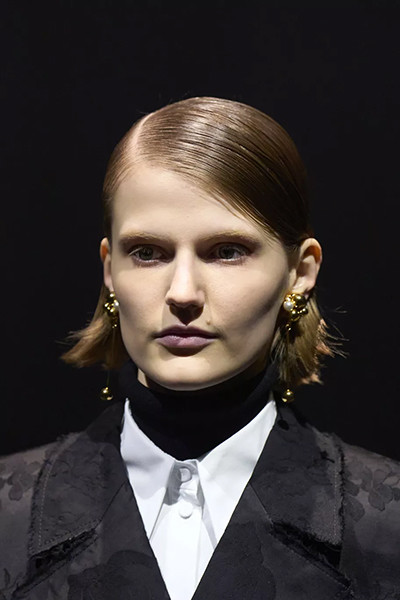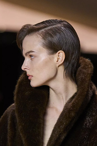 ジョルジオ アルマーニ 2022-2023年秋冬コレクション、「ウェットヘア」風ぺたんこシニヨン。