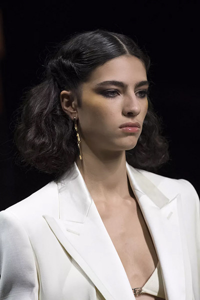 フェンディ 2022年春夏コレクション、サイドにねじりを入れたヘア。