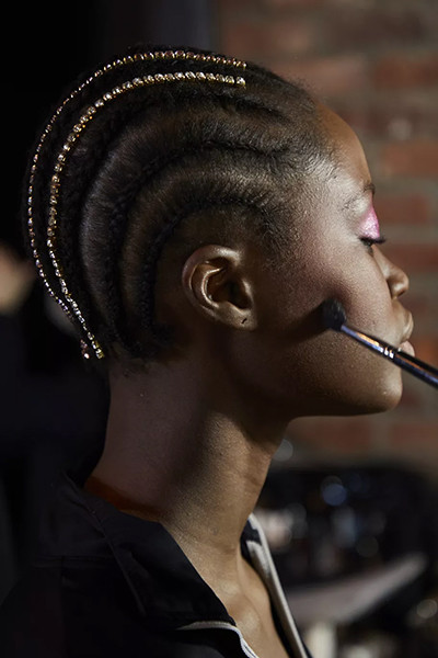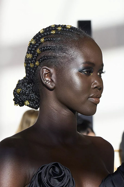 スキャパレリ 2022年春夏オートクチュール・コレクション、ジュエリーをあしらったアフリカンブレイドヘア。