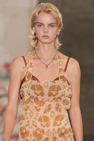 アナ・スイ 2022年春夏コレクション、横髪を垂らした90年代風。