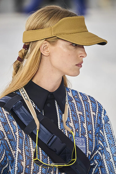 ラコステ 2022年春夏コレクション、三つ編みを2箇所で留めたヘア。