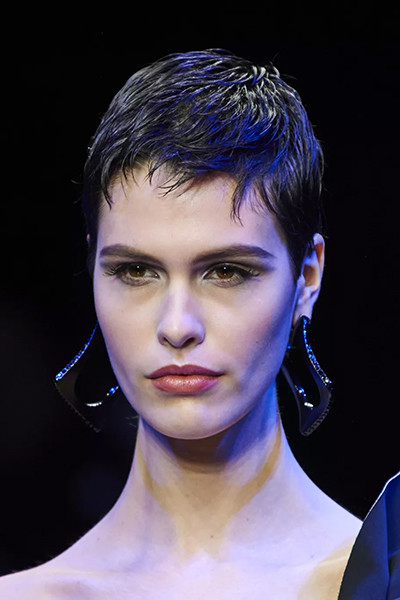 ジョルジオ アルマーニ 2022-2023年秋冬コレクション、ウェットヘア風ベビーバングショート。
