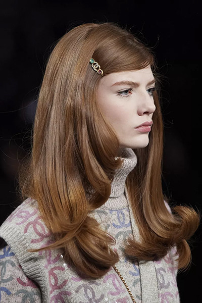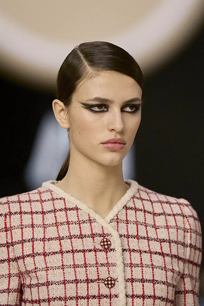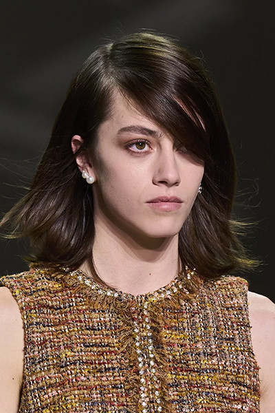 シャネル 2022-2023年秋冬オートクチュール・コレクション、分け目をサイドにずらしたスタイル。