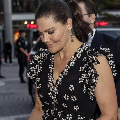 ロックな雰囲気のお団子ヘアには、スウェーデンのヴィクトリア王太子のようにグラムパンクテイストのヘアバンドを合わせると良い。(ストックホルム、2018年6月14日)