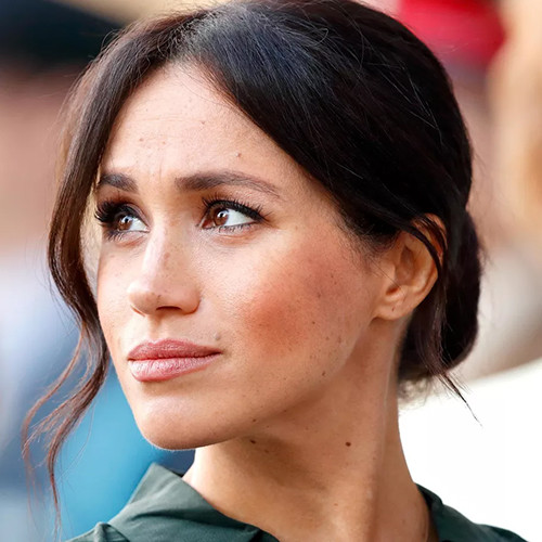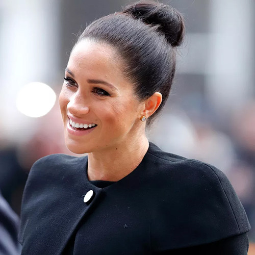 髪を後ろでまとめ、頭上でまとめたお団子ヘアは、メーガン妃によるアレンジバージョン。(ロンドン、2019年1月31日)