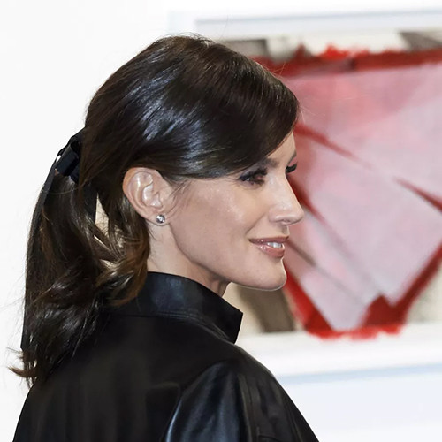 スペイン王妃は、シンプルなポニーテールをよりスタイリッシュにする方法を知っている:黒いリボンを付ける。(マドリード、2019年2月28日)