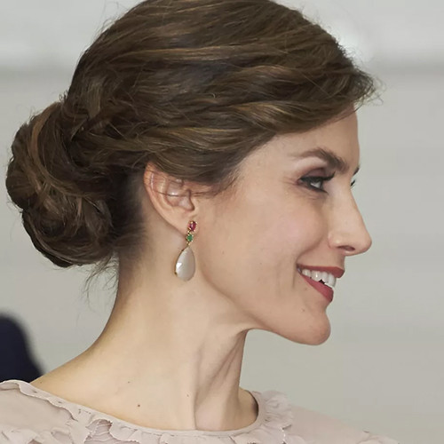 スペインのレティシア王妃のお団子ヘアをふんわり見せる秘訣は数本三つ編みを加えること。(ラス・パルマス・デ・グラン・カナリア、2017年4月24日)