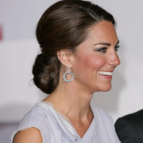 カーブしたヘアスタイルと低い位置でのお団子ヘア:キャサリン妃はグラマラスなヘアスタイルを提案。(2012年7月30日、ロンドン)