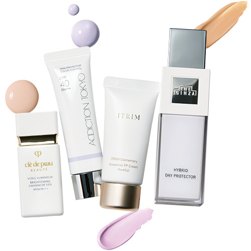左から2番目:「肌ストレスゼロで、透明感アップ」(貴子)。91%が美容液成分。黄みを抑え、透明感を引き立てるラベンダーカラー。スキンプロテクター カラーコントロール SPF40・PA+++ 001 30g ¥4,180/アディクション ビューティ