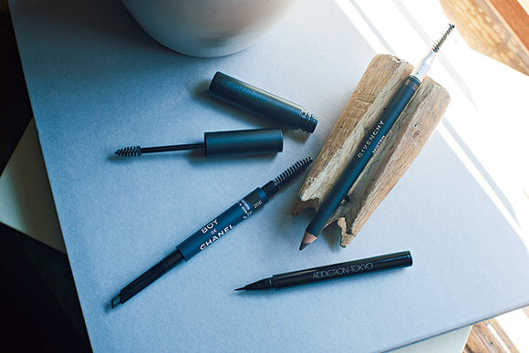 左上:眉毛にツヤを与えて落ち着かせる、専用の透明マスカラ。さっととかすだけですっきり洗練された目元に。インディケイト アイブロウマスカラ パール ¥3,080/セルヴォーク 左下:眉の隙間を埋め、形を整えるのに適した斜め芯。太めの眉に合う大きめのスクリューブラシ付き。ボーイ ドゥ シャネル アイブロウ ペンシル 全3色 ¥5,500/シャネル 右上:ふわっとパウダリーに変化するので、濃い色も軽いタッチで自然に描ける。パルファム ジバンシイ ミスター・アイブロウ・ペンシル 全3色 ¥3,300/LVMHフレグランスブランズ 右下:繊細な色と筆で、アートメイクのように眉毛1本1本をリアルに再現。アイブロウリキッド マイクロ 全4色 ¥2,750/アディクション ビューティ