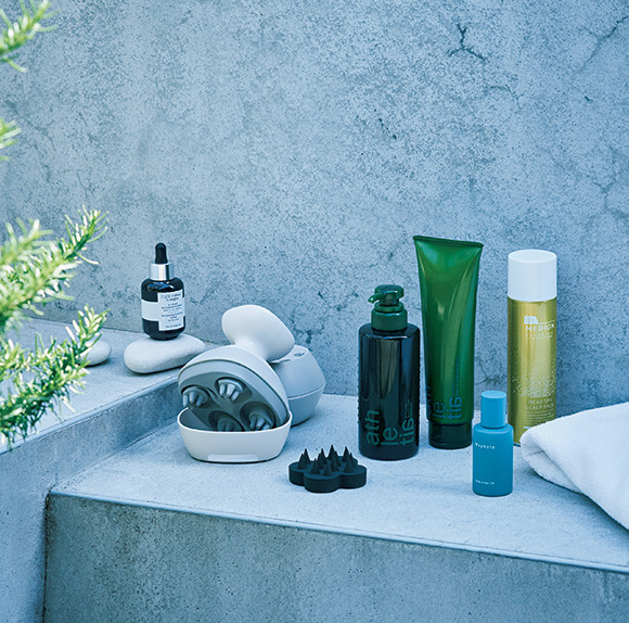 左:ビタミン、ミネラル、植物エキス、タンパク質など有効成分を高濃度配合。抜け毛悩みに対応する。ヘア リチュアル フォーティファイング セラム フォー ザ スカルプ 60ml ¥22,880/シスレージャパン 左から2番目:2種のアタッチメントで頭皮を掴んで揉み洗う。根元からハリ・コシがアップ。頭皮エステ サロンタッチタイプ〈スパイラル&スライド〉EH-HE0G ¥22,000(編集部調べ)/パナソニック 左から3番目:ほどよい硬さと刺激で、シャンプー時にもツボ押しにも。スカルプブラシ ケンザン ¥2,200/ウカトーキョーヘッドオフィス 右から3番目:サルフェートフリーで豊かな泡立ちのシャンプーと、入浴中に頭皮マッサージするトリートメント。精油の香りに満たされて、髪がふわっと立ち上がる。左から、スカルプケア シャンプー 300ml ¥4,400、スカルプ&ヘア トリートメント 250g ¥4,950(ともに7/1発売)/ともにアスレティア 右から2番目:植物のオイルとエキスをブレンド。固くなった頭皮がゆるみ、毛先まで艶やかに。スキャルプ&ヘアオイル 40ml ¥4,950/ワフィト 右:シャンプー前に血行を促す高濃度炭酸泡で頭皮をパック。クレイが汚れや皮脂を吸着し、すっきり爽快! ドクターメディオン ヘッドスパ スカルプパック 150ml ¥3,850/メディオン・リサーチ・ラボラトリーズ