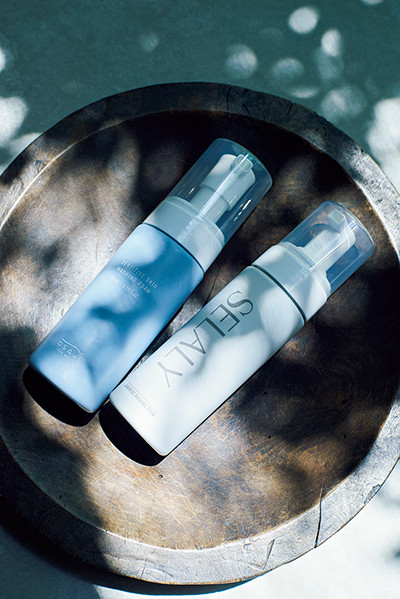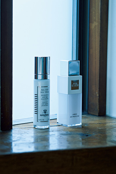 左:環境ストレスから肌を保護すると同時に、本来の防衛機能を活性化。ボタニカルな香りと乳液の軽やかさは虜になる。オールデイ オールイヤー N 50ml ¥46,200/シスレージャパン 右:美容液、紫外線防止、肌色補正を兼ね備えた1本。スフレのような感触で、するんとなめらかな毛穴レス肌に。ハイブリッドデープロテクター SP F33・PA+++ 30g ¥33,000/ザ・ギンザ