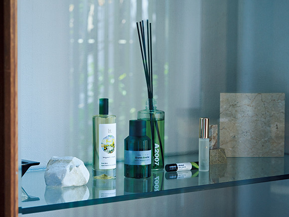 左:ベルガモットの精油が心を鎮め、不安から解放。ふわりと温かく香る、ヴィーガンフレグランス。ルームスプレー ベルガモット クラウズ 100ml ¥7,700/ロー 左から2番目:ベルガモットやマンダリン、ネロリなどで良質な眠りに誘うピローミスト。マリージャンヌ ルームフレグランス ブリューム ドレイエ 100ml ¥7,150/パリスドット 左から3番目:ストレスホルモンを抑えて幸福感に満たされる、パルマローザやクラリセージ、ゼラニウムなどのブレンド。サウザンドカラーズ A2007 ハグ ディフューザー 150ml ¥18,150/カラーズ 右から2番目:ティートゥリーやサイプレス、ホーリーフの精油とCBDが、心身のバランスを調整し、“いま”にフォーカス。ロールオンタイプ。ボタニカルCBDフレグランス バランス 8ml ¥4,290/エリクシノール 右:ブラックスプルースにローズなどの透明感あふれる芳香で、心地よく覚醒。衣風ifオーデコロン N.L.48¯ 14ml ¥10,780/イトリン