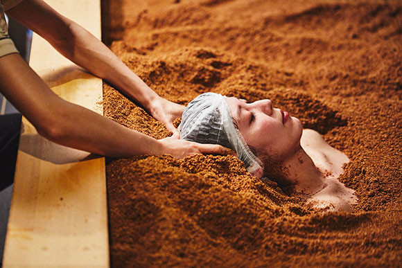 北海道産針葉樹のおがくずを微生物と植物エキス発酵液で発酵させて生まれる熱を利用した温浴は、じんわりと身体の芯から温め、汗とともに老廃物や毒素を排出。酵素浴中はヘッドマッサージも。自然のエネルギーを感じてリラックス。
