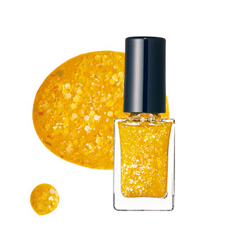 透けるイエローに、偏光ラメと白のさまざまな形のグリッターがぎっしり。数本の指のアクセントにつけたり、爪先に重ねたり、遊び心あふれるネイルは手にも足にも活躍。エレガンス ラズル エナメルラッカー 13 ¥1,320/エレガンス コスメティックス