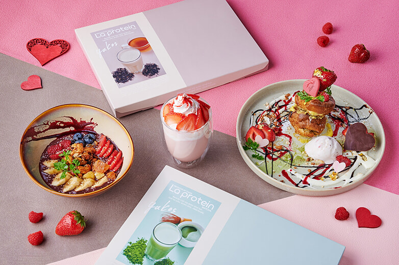 今回のコラボレーションでは、ラ プロテインの抹茶味とミルクティー味、ふたつのフレーバーを使用した3種のメニューが登場。どれも1食で12gのタンパク質を摂ることができる。思わず写真を撮りたくなるビジュアルも気になる!