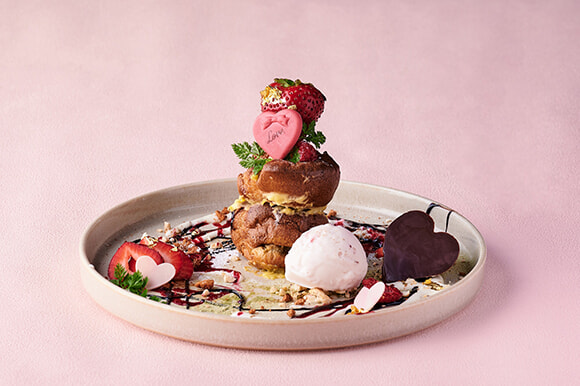 抹茶フレーバーのプロテインを練り込んだポップオーバーと、完熟の国産イチゴ、ストロベリーマスカルポーネのハーモニーを味わって。“ラ プロテイン 抹茶”のポップオーバー ¥2,000(平日限定カフェセット ¥2,400)※税・サービス料込