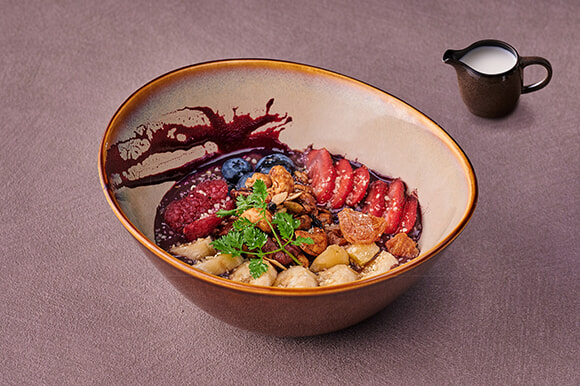 アサイーピューレにミルクティー味のプロテインをブレンドし、アマニ、ピーカンナッツなどのスーパーフード入りグラノーラとフルーツをたっぷりトッピングしたヘルシーなひと皿。アーモンドミルクで溶いた“追いプロテイン”付き。“ラ プロテイン ミルクティー”のアサイーボール ¥2,000(平日限定カフェセット ¥2,400)※税・サービス料込