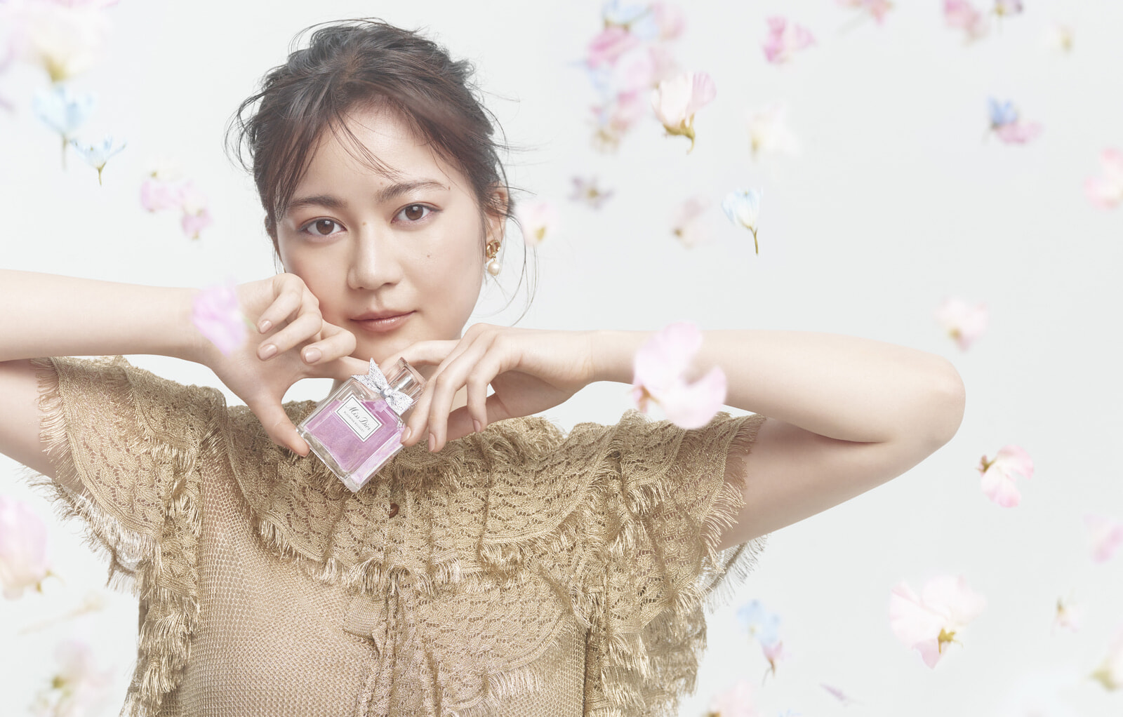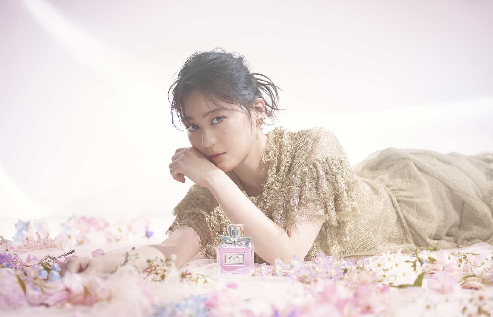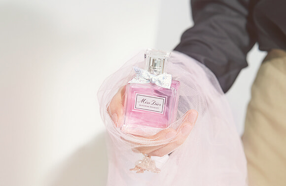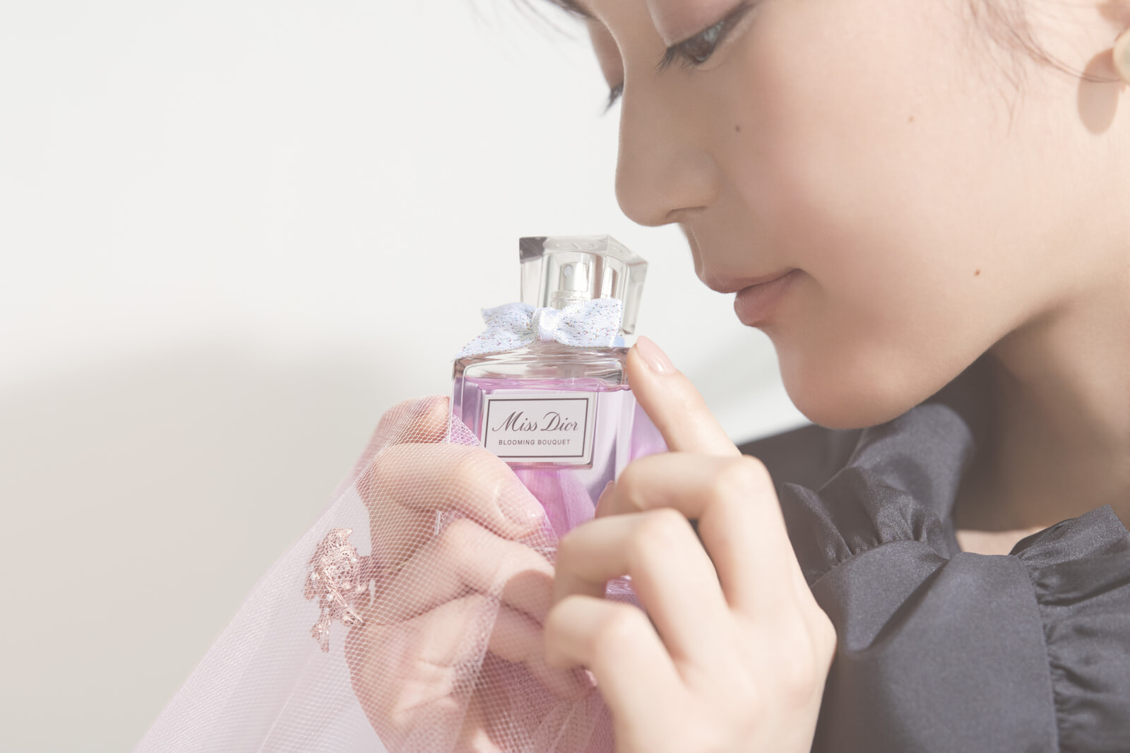「ミス ディオールって、もっと甘くて可愛らしいイメージを抱いていたのですが、今回の撮影で感じ方が変わりました。ミス ディオール ブルーミングブーケは、心地いい甘さはありながら、爽やかでみずみずしいところが好き。花束のフレッシュな空気を纏うような爽やかな香りです」