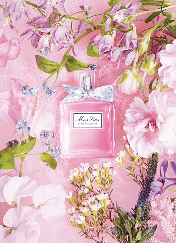 ボトルに結ばれたジャガード織のリボンは、仏ロワール地方の老舗アトリエで手織りされたもの。ひとつとして同じものが存在しないクチュールな美しさは格別だ。幸せが満開になった瞬間を閉じ込めたような香りは、ピオニーとローズが響き合うブーケに、カラブリアン ベルガモットが爽やかに煌めいて。ブーケを包み込むホワイト ムスクの柔らかな余韻がたおやかな印象を残す。ミス ディオール ブルーミング ブーケ 30ml ¥8,690、50ml ¥13,750、100ml ¥19,250/パルファン・クリスチャン・ディオール