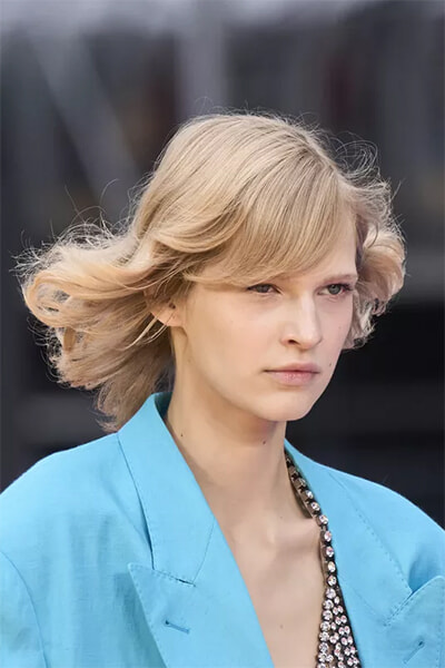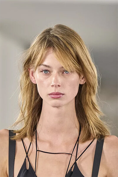 「もう少し直線的なラインでシャギーな雰囲気を出すオプションもあります」。デルフィーヌ・クルテイユもファラ・フォーセットを例に出しながら、この70年代のトレンドを推す。「イメージはカーテンバングだけど、もう少し長くして、動きを与えることが重要です。セリーヌグッチなどのメゾンが再び流行らせたヴィンテージなブローが前髪に動きを与えてくれます」