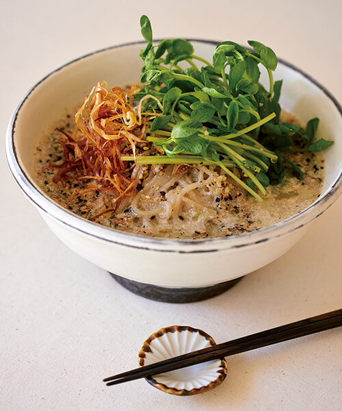 8. うつわに6のスープを1/3程度入れ、7を入れてほぐし、残りのスープを入れ、1の豆苗と2をのせ、3をかける。