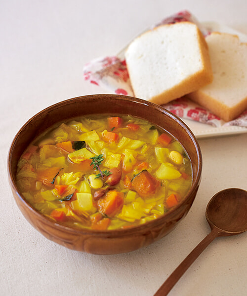 洋食気分の時や、週末ブランチにぴったりなのが米粉パン。トーストすると、炊きたての米の香りともっちり食感が楽しめ、腹持ちもいい。野菜と豆をたっぷり使った食べるスープは、胃腸の疲れを感じた時にも。抗アレルギー、血液浄化作用のあるターメリックを使った食養生になる。デトックス効果を高めたい時は、緑豆を使うとさらに効果が期待できる。バターをギーに代えるのもおすすめ。